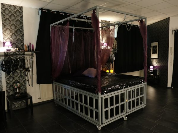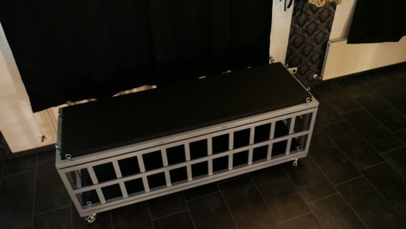 Der zwei Meter lange Bondage- und Liegekäfig lässt sich auf Rollen im gesamten Studio beliebig verschieben und abschließen.