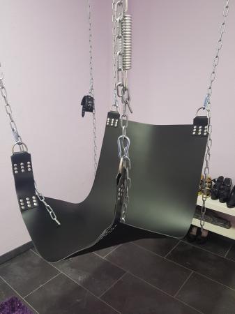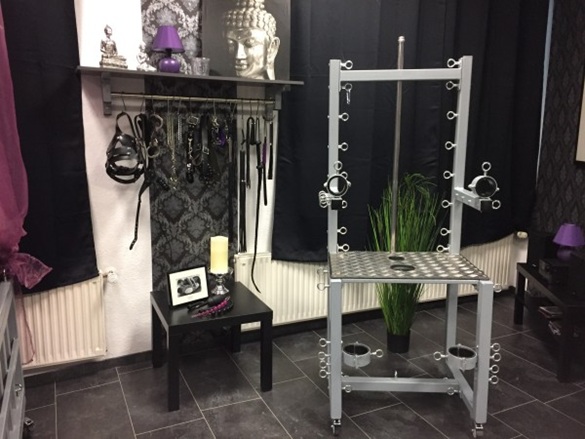 Ein großes Bondagegestell bietet viele Möglichkeiten. Eine kleine Fesselung bis hin zum Japan Bondage. Hier ist alles machbar. Eine Liebesschaukel aus Leder und ein Flaschenzug runden das Bild ab.