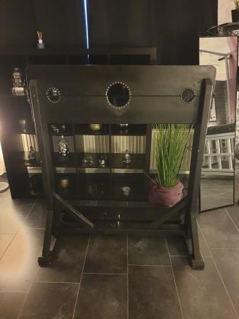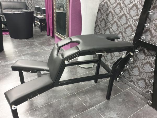 Der Fesselstuhl ist in seiner ganzen Pracht angekommen und es eröffnen sich nun neue Grenzen. Stahlfesseln legen sich um die Hand- und Fußgelenke, so dass es kein Entrinnen mehr gibt. Aber das ist noch nicht alles. Mit den runden Stahlösen an den Armlehnen und etwas Bondageseil lässt sich die Fesselung schnell komplettieren. Zudem sorgt die in die Rückseite des Fesselstuhls integrierte Stange für eine besonders gute Haltung.